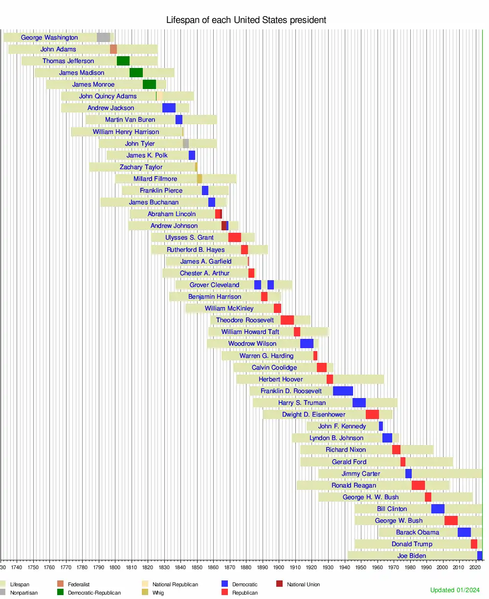 In this list of presidents of the United States by age, the first table charts the age of each president of the United States at the time of presidential inauguration (first inauguration if elected to multiple and consecutive terms), upon leaving office, and at the time of death. Where the president is still living, their lifespan and post-presidency timespan are calculated up to January 12, 2024.