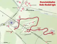 In 1935, Igls hosted the two-man event of the world bobsleigh championships when the track ran from Römerstrasses to the Patscherkofel valley railroad station.[1][3] Several fatal accidents at the finishing curve occurred during competition, causing temporarily closure of the track until safety measures were introduced.[1] In 1960, Innsbruck was awarded the 1964 Winter Olympics which led to the construction of separate bobsleigh and luge tracks for the games.[4] Track construction began in September 1961 and was officially completed in July 1963 following test runs of both tracks, including twenty injuries during the 1963 FIBT World Championships on the bobsleigh track.[4][5] Prior to the start of the 1964 Winter Olympics, British luger Kazimierz Kay-Skrzypeski was killed in a training run on the luge course.[6] When Denver, Colorado, in the United States withdrew in 1972 after being awarded the 1976 Winter Olympics two years earlier for financial reasons, the International Olympic Committee offered the games to 1976 runner-up Whistler, British Columbia in Canada (northeast of Vancouver), but Whistler declined in the wake of the provincial elections in 1972. As a result, the IOC gave the games to Innsbruck. Construction on a new, combined track was started in 1973 under the auspices of the International Bobsleigh and Tobogganing Federation (FIBT) and the International Luge Federation (FIL) and completed the following year.[1][7] The track was praised by the FIL during testing in 1975 [8] and proved so successful that it fostered a commission with the FIBT and the FIL on construction of combination tracks in 1977 that continues to this day.[9] (Known as homologation, an example of this dual certification process occurred prior to the 2006 Winter Olympics, when adjustments to the track at Cesana Pariol were made following FIL concerns about the run.[10][11]) The track added a restaurant and was extended in 1981.[1] In 1990–1, the ladies start house at the fifth turn was renovated and the finishing stretch was extended in 1998.[1] The track was part of the OlympiaWorld-Innsbruck in 2004, the same year a general refurbishment was done on the concrete shell.[1] Today, it serves as a training facility for new bobsledders and skeleton racers.[12] It hosted the bobsleigh, luge, and skeleton events for the 2012 Winter Youth Olympics.[2]