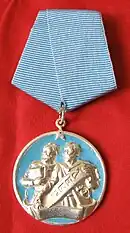 Awarded to personnel of the troops of the Ministry of Transport of the People's Republic of Bulgaria for merits. This medal is exactly the same in design as the For Merit in the Railway Troops of the People's Republic of Bulgaria award it replaced when the department changed its name. | ||