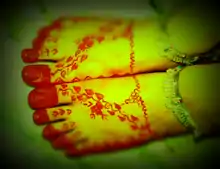 "Aḷatā pindha" (Decorating feet with Alata, a red liquid that is used to paint the feet of the bride and groom during marriage)