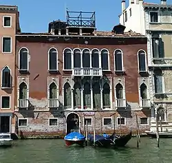 The building is fully covered with brown plaster. The structure is a mix of Gothic and Renaissance architectural styles and is among the lowest buildings located between the San Polo and San Tomà canals.[2][3] The ground floor, devoid of the mezzanine, has a water portal of modest dimensions is positioned towards the left side—perhaps once it was paired with another portal now walled up. The first noble floor has a central lancet-shaped pentafora and two pairs of lateral monoforas, all decorated by a serrated frame. The curious fact is that the side windows have balconies while the central polifora does not, probably because of a modern renovation. The second noble floor offers the same openings layout but its windows have round arches. The second-floor polifora has balcony under its three central openings.
