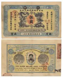 During the late Qing dynasty period the old paper notes remained in common usage; these included the traditional privately produced paper notes which were printed on one side of the bill issued by merchant banks known as qianzhuang (錢莊), yinhao (銀號), and shangpiao (商票) and pawn shops known as diandang (典當), as well as the old-style banknotes issued by provincial government institutions, to the modern banknotes which were introduced by a dozen or so of foreign banks operating in China and modern Chinese banks which were created in very large numbers in the later years of the 19th century. Furthermore, there were also banknotes which were brought into the Chinese financial markets by imperial government-owned firms like railway companies, and foreign bills coming to China through the trade ports like Shanghai. The large spectrum of these types of paper money reflected the structure of the general Chinese credit market in the late Qing period.[16] The traditional Chinese credit institutes were local qianzhuang banks, yinhao banks, piaohao banks, and pawnshops, of which a considerably number was always to be found in each city across the Chinese Empire. Many provincial governments founded their own local provincial, state-owned banks which were known as guanqianju (官錢局) or guanyinhao (官銀號); in some provinces even several modern credit institutes were to be found, like the Yuning Bank (裕寧官銀錢局) and the Yusu Bank (裕蘇官銀錢局) in the province of Jiangsu. Quite a few of these provincial credit companies opened branches in other provinces due to their success.[16]