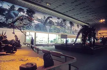- The Great Hall of Dinosaurs (this exhibit will be in the same place with same mural after renovation) with the skeleton of a Brontosaurus.[10][11]
