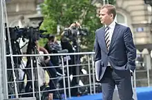 In May 2016, Orpo announced that he would challenge the chair of the National Coalition Party and incumbent Minister of Finance Alexander Stubb in June's party conference.[8] At the time, Orpo joined second-term parliamentarian Elina Valtonen in seeking to replace Stubb.[9] In contrast to polyglot and outspoken Stubb, Orpo was widely seen as a careful consensus-seeker with little experience of international politics.[10] Orpo received 441,4 votes against Stubb's 361 and was thus elected as the new chair for the party.[11] Orpo soon announced that he would take Stubb's seat as the Minister of Finance.[12] He was officially appointed as the Minister of Finance on 22 June 2016.[13]