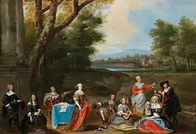 In a large group portrait entitled An architect showing plans to a family in aristocratic attire in a landscape the artist animates the portrait of three generations of a family through his sense for psychology. The elder parents in black clothes are depicted on the left. Their daughter stands towards the middle, while her husband (an architect as shown by the plan on the table) and her son point towards her. At the extreme right stands the elderly couple's son. The servant filling his glass is pointing at him, as does his daughter with her small guitar. His wife sits in front of him. A small running dog at the bottom center symbolizes loyalty. In the background runs a small brook, probably the Maelbeek near Brussels.[4]