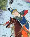 Tabari says that Sarm and Tuj ruled the earth for 300 years after they had killed their brother.[107] Manushihr, a descendant of Iraj,[108] becomes king and avenges Iraj's murder, by killing Sarm and Tuj. Manushihr's rule was “described as just and generous”.[107] Towards the end of his reign, he is attacked by Frasiyab, king of Turan (that is of the Turks) and a descendant of Tuj. An agreement is made whereby the boundary between their realms is set by having an Iranian archer shoot an arrow from a mountain and where it lands will form the frontier. The arrow landed near Balkh at the Oxus river, which becomes the boundary between the Iranians and the Turks.[109]