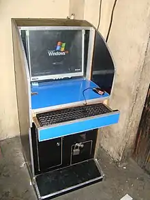 One of the first practical pisonet machines. The computer is running Windows XP. Under the mouse is a keyboard stored in a keyboard tray that can be closed when the machine is not in use.