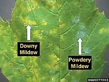 Example of powdery mildew (right) along with Downy mildew on a grape leaf