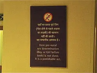 Prenatal sex determination was banned in India in 1994, under the Pre-Conception and Pre-Natal Diagnostic Techniques Act, 1994.[5] The act aims to prevent sex-selective abortion, which, according to the Indian Ministry of Health and Family Welfare, "has its roots in India's long history of strong patriarchal influence in all spheres of life". Prenatal sex determination has caused the child sex ratio to go down at alarming rates, in India, which is also another factor that led to its banning.[6] However, the Supreme Court of India has accused the Government of India of poor implementation and enforcement of the act.[7] Over time, there has been a substitution effect of more families participating in pre-natal sex determination instead of the previously popular act of female foeticide.