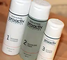 Proactiv is an American brand of skin-care products developed by two American dermatologists, Katie Rodan and Kathy A. Fields, and launched in 1995 by Guthy-Renker, a California-based direct marketing company, that was endorsed by famous celebrities[2] The range includes moisturizers, body washes and treatment products, but the brand is known for its three-step anti-acne Solutions 3-step routine consisting of a BPO cleanser, glycolic toner and treatment lotion.[3][4] Proactiv+, a reformulation of the three-step kit, was introduced in 2013, and in 2017, ProactivMD launches powered by Adapalene.[5]