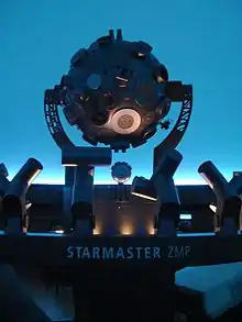 The planetarium uses a Starmaster projector, manufactured by Carl Zeiss AG, which was installed in 2006 to replace the original Universarium III purchased in 1952. 44 additional projectors are also used.[3] The projection dome has a capacity of 300 people, with a circular arrangement of reclining seats and projection at the top of the dome.[1] The dome spans 18 metres (59 ft),[2][7] and is on one floor[4] with a mezzanine.[3] The metal and concrete half-dome is surrounded by a yellow disk, and the interior is made of wood.[5]