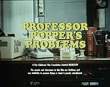 The screenplay was written by Leo Maguire, based on an original story by Richard Loncraine.[1][15] Maguire previously worked with producer Simpson on CFF film Kadoyng (1972), "demonstrating the Foundation's preference for familiar faces".[26] Ian Millsted of Infinity magazine notes that CFF screenplays of the 1970s—including Professor Popper's Problem—remedied critiques of its features of the 1950s and 60s, which suggested "that they seemed to be set on an alien world where all the children spoke the Queen’s English [...], behaved with impeccable morals and were routinely smarter than any adult".[27] According to Millsted, this was achieved by deploying "noticeably more regional accents and working class characters", relegating science-fiction elements to jovial plot points rather than intrinsic storylines. Notwithstanding, "gadgets and gimmicks became the order of the day".[28] In this Professor Popper's Problem was typical, using special effects by Tom Howard and deliberately oversized props on a "very small budget" of £250,000.[3][15][lower-alpha 4] O'Hara remarked that many props were borrowed since "nobody minded really as it was a CFF film", also praising Howard, "who was really talented at making the money go a long way".[24] Edited by James Needs, Ken Hodges was responsible for the picture's photography, joined by George Provis as art director and Tony Hart on title design.[15][1]