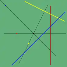 Three pairs of dual points and lines: one red pair, one yellow pair, and one blue pair.