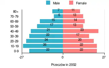 According to the 2002 Poland census, there were 315 people residing in Przeczów village, of whom 50.8% were male and 49.2% were female. In the village, the population was spread out, with 25.7% under the age of 18, 36.2% from 18 to 44, 19% from 45 to 64, and 19% who were 65 years of age or older.[1]