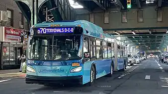 In December 2015, the MTA announced that the Q70 SBS would be implemented in September 2016,[31][32] when it was rebranded as the LaGuardia Link with the implementation of off-board payment of fares. This is similar as to what the Riders Alliance proposed, but the route would still require a free transfer or a regular fare.[33] As opposed to other SBS routes, the Q70 was to be wrapped in a teal blue scheme with silhouettes of clouds and airplanes. The buses would also have the text "LaGuardia Link" on the front, back, and both sides, in addition to the route emblems for the E, F, M, R, and 7 routes and the abbreviation "LIRR," which connect to the bus at Woodside–61st Street and at Jackson Heights–Roosevelt Avenue. The rebranding was to encourage more people to take public transportation when using the airport.[34][35] The insides of the buses were to have air traveler branded messaging.[2]