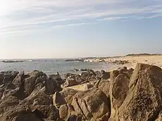 In northern section of Quião beach, where the waterfront street ends, the traditional Sargassum seaweed gathering is still practiced; it is spread and laid in the beach for sun drying,[1] leaving a pleasant sargassum breeze in the beach, before being pilled to make "medas". This area is protected by dunes, the gneiss. Given its quietude, can be occasionally used naturists, and as a flirting area. It is increasingly popular by other groups of people. In 2016, a boardwalk was built crossing all Cape Santo André, allowing an easy cross of Northern Quião, it is used by the Portuguese Coastal Way of Saint James.[2]