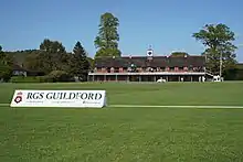 The Royal Grammar School, Guildford (originally 'The Free School'), also known as the RGS,[3] is a selective private day school for boys in Guildford, Surrey in England. The school dates its founding to the death of Robert Beckingham in 1509 who left provision in his will to 'make a free scole at the Towne of Guldford'; in 1512 a governing body was set up to form the school. The school moved to the present site in the upper High Street after the granting of a royal charter from King Edward VI in 1552.[4] Around that time, its pupils were playing cricket and their activity was later documented as the earliest definite reference to the sport. The school's Old Building, constructed between 1557 and 1586, is the home of a rare example of a chained library. It was established on the death of John Parkhurst, Bishop of Norwich, in 1575.[5] Although defined as a 'free' school, the first statutes of governance, approved in 1608, saw the introduction of school fees, at the rate of 4 shillings per annum, along with the school's first admissions test.[6] During the late 19th century the school ran into financial difficulty, which nearly resulted in its closure. A number of rescue options were explored, including amalgamation with Archbishop Abbott's School. Funds were eventually raised, however, which allowed the school to remain open, although boarding was no longer offered.[7]