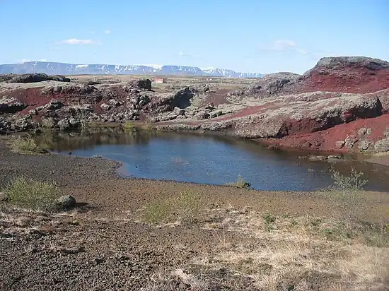 The Rauðhólar built up on a location where lava flows entered and covered a small lake just north of today's Elliðavatn.[5]