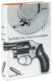 In 1962, Hawkey was Deighton's choice to design the cover of his first novel The IPCRESS File, which some regard as the template for the covers of all subsequent airport novels.[8] He went on to design covers for Deighton's books, including Horse Under Water, Funeral in Berlin and The Action Cookbook (where the IPCRESS revolver reappears, this time with a sprig of parsley in the barrel).[9]