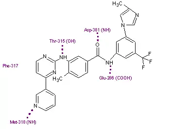 Imatinib binds to Abl domain via six hydrogen bond interactions. This stabilizes the imatinib Bcr-Abl complex and prevents ATP from reaching its binding site.[4][8][10] The hydrogen bonds involve the pyridine-N and backbone-NH of Met-318, the aminopyrimidine and side chain hydroxyl of Thr-315, the amide-NH and side chain carboxylate of Glu-286, the carbonyl and backbone-NH of Asp-381, the protonated methylpiperazine with the backbone-carbonyl atoms of Ile-360 and His-361. Additionally, a number of van der Waals interactions contribute to binding.[8] A hydrophobic pocket is formed by amino acid residues Ile-293, Leu-298, Leu-354 and Val-379 around the phenyl ring adjacent to the piperazinyl-methyl group of imatinib.[10] At the time of its discovery, in the absence of structural information, no clear explanation for the impressive selectivity of imatinib could be found.[6]