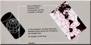• Both projections are cylindrical: for the Normal Mercator, the axis of the cylinder coincides with the polar axis and the line of tangency with the equator. For the transverse Mercator, the axis of the cylinder lies in the equatorial plane, and the line of tangency is any chosen meridian, thereby designated the central meridian.