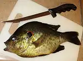 The redear sunfish generally resembles the bluegill except for coloration and somewhat larger size. The redear sunfish also has faint vertical bars traveling downwards from its dorsal.[3] It is dark-colored dorsally and yellow-green ventrally. The male has a cherry-red edge on its operculum; females have orange coloration in this area. The adult fish are between 20 and 24 cm (7.9 and 9.4 in) in length. Max length is 43.2 cm (17.0 in), compared to a maximum of about 40 cm (16 in) for the bluegill. Redear sunfish on average reach about 0.45 kg (0.99 lb), also larger than the average bluegill.[4]