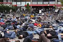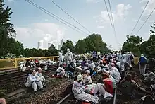 Actions and tools that belong to common repertoires of contention include, but are not limited to: creation of special-purpose associations and coalitions, public meetings, solemn processions, vigils, rallies, demonstrations, sit-ins, petition drives, statements to and in public media, boycotts, riots, strikes and pamphleteering. Repertoires change over time, and can vary from place to place.[2][4] They are determined both by what the actors know how to do, and what is expected from them.[4] Early repertoires, from the time before the rise of the modern social movement, included food riots and banditry.[2] The changing nature of repertoires of contention can be seen in a sample element of the mid-18th century British repertoire of contention, the rough music: a humiliating and loud public punishment inflicted upon one or more people who have violated the standards of the rest of the community.[5] For yet another example, consider that in the recent years, Internet-focused repertoires have been developed (see hacktivism).[1] Recent scholarship has introduced a notion that in addition to the "traditional" and "modern" repertoires, a new, "digital", repertoire may be emerging.[6] In the wake of the COVID-19 pandemic modes of contention at the intersection of physical and digital evolved, described by Yunus Berndt as peopleless protests.[7]