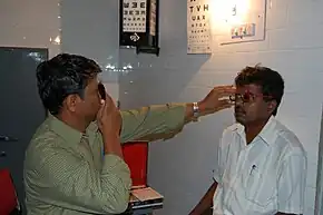 Retinoscopy (Ret) is a technique to obtain an objective measurement of the refractive error of a patient's eyes.[1] The examiner uses a retinoscope to shine light into the patient's eye and observes the reflection (reflex) off the patient's retina. While moving the streak or spot of light through the pupil across the retina, the examiner observes the relative movement of the reflex or manually places lenses over the eye (using a phoropter or trial frame and trial lenses) to "neutralize" the reflex.[2]