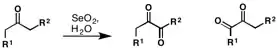 The mechanism of oxidation of -CH2C(O)R group by SeO2 has been well investigated.[4][5][6][7] The oxidation of carbonyl alpha methylene positions begins with attack by the enol tautomer at the electrophilic selenium center. Following rearrangement and loss of water, a second equivalent of water attacks the alpha position. Selenic acid is liberated in the final step to give the 1,2-dicarbonyl product.