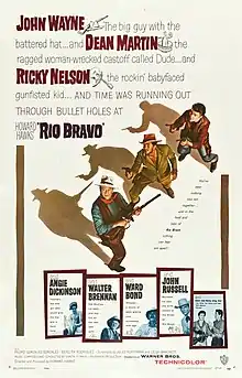 Rio Bravo is a 1959 American Western film directed and produced by Howard Hawks and starring John Wayne, Dean Martin, Ricky Nelson, Angie Dickinson, Walter Brennan, and Ward Bond. Written by Jules Furthman and Leigh Brackett, based on the short story "Rio Bravo" by B. H. McCampbell, the film stars Wayne as a Texan sheriff who arrests the brother of a powerful local rancher for murder and then has to hold the man in jail until a U.S. Marshal can arrive. With the help of a lame old man, a drunk, and a young gunfighter, they hold off the rancher's gang. Rio Bravo was filmed on location at Old Tucson Studios outside Tucson, Arizona, in Eastmancolor, with film processing provided by Technicolor.[5]