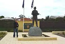 Hitchcock standing next to one of his (larger than life) figures at the SAS Garden of Reflection, Perth, Western Australia