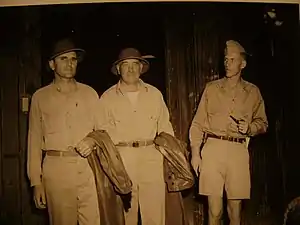 ![]() (L-R) Cdr. W.R. Specht, Admiral E.C. "Mike" Moran, and LCdr. R.B. Kelly at Rendova, May 1944 | |