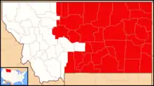 TerritoryMontana Big Horn, Blaine, Carbon, Carter, Cascade, Chouteau, Custer, Daniels, Dawson, Fallon, Fergus, Garfield, Golden Valley, Hill, Judith Basin, Liberty, McCone, Musselshell, Park, Petroleum, Phillips, Powder River, Prairie, Richland, Roosevelt, Rosebud, Sheridan, Stillwater, Sweet Grass, Treasure, Valley, Wibaux and Yellowstone counties in eastern Montana