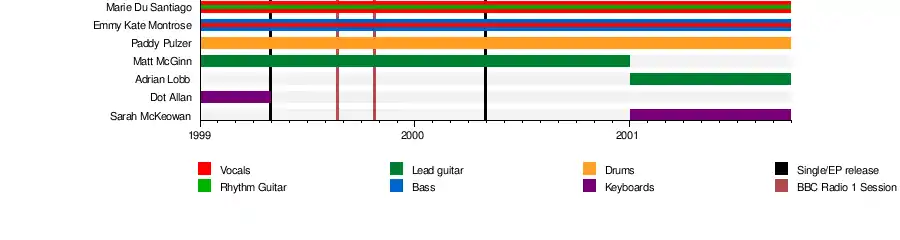The new band was unveiled in March 1999 - as a major news item with both the NME[4] and Melody Maker[5] - with a line-up of Du Santiago on lead vocals and rhythm guitar and Montrose on bass and backing vocals. Completing the line-up were, on guitar, Matt McGinn - (not the singer/songwriter of the same name) who was previously a guitar technician for Kenickie and Paddy Pulzer, formerly of Swervedriver (and concurrently with Jack) on drums. Dot Allan, Kenickie's former live keyboard player, was also initially involved but dropped out after the band's debut mini tour of southeast England.