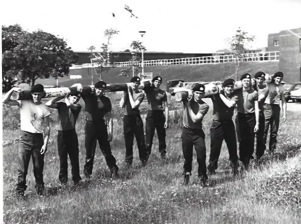 When at Raleigh there were generally 2 or 3 sessions of Physical Training per day along with Practical Leadership Tasks. Emphasis during training was also given to improving Cadets’ written and verbal communication skills with the purpose of improving their self confidence when addressing or briefing others. When it was necessary, individual/one on one Lecturing skills training was carried out that proved to be highly successful. Training activities in the field were conducted such as map reading, navigation, first aid, basic RT procedures and survival skills. The Physical Training included gymnasium work, obstacle courses and speed marches (often with loaded Bergens) to improve Cadets’ levels of physical fitness. ‘Log runs’ were conducted where teams of Cadets raced each other while each team carried a telegraph pole sized log - these were frequent events that all formed part of Rowallan's team building ethos. This paragraph was edited by an unknown user who seems to have first hand knowledge, the words he added at this point are "Did me no harm at all. Excellent lifetime experience.".