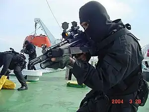 PASKAL operatives with MP5A5 submachine guns fitted with M68 Close Combat Optic, B&T flashlight handguard and Vortex muzzle suppressor practising boarding skills in MISC merchant vessel.