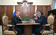 Defense Minister Sergey Shoygu reporting to Vladimir Putin on the fire