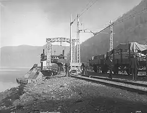 Rjukanfos was the first ferry delivered to Norsk Transport for the Tinnsjø railway ferry service. Built by Fevig Jernskibsbyggeri in 1908–09, she was delivered 43 meters (142 ft) long, at 338 gross register tons. There were two parallel standard gauge tracks down the length of the ship, in total 66.6 metres (219 ft), with a single track to loading at the front. The nine railway wagons could hold 240 tonnes, in addition to 120 passengers. She was equipped with two 150 kW (200 hp) steam engines, and capable of 9 knots.[1][2]