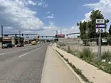 State Highway 26 (SH 26) is a 3-mile (4.8 km) long state highway in Denver, Colorado, United States. It follows a portion of Alameda Avenue, stretching east from SH 95 (Sheridan Boulevard) at the west city limits to Kalamath Street within the Interstate 25 (I-25) and U.S. Route 85 (US 85) interchange (I-25 exit 208). It formerly continued west through Lakewood to US 40 near I-70 exit 259.