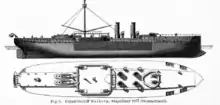 Stosch had instructed the design staff to begin work on the next corvette already in 1872, before they had been authorized under the 1873 fleet plan. Work on what became the Sachsen class continued into 1874.[5] Their roles imposed several design limitations on the vessels. The vessels were designed to operate in coastal areas, which required a shallow draft in order for them to be able to enter any port on the Baltic seaboard. They also required a heavy armament and think armor plate, in order for them to be able to engage any hostile ironclad on equal terms. Because Stosch envisioned only local deployments for the vessels, they did not need a high top speed or a long cruising radius. As a result, they had limited coal stowage, as they would operate close to their bases and could easily replenish fuel. A supplemental sailing rig was rejected for the same reason. Initially, 30.5 cm (12 in) guns were considered, but the design staff decided to use lighter 26 cm (10 in) guns instead. The designers adopted the basic format of the British breastwork monitors, but rather than employing the heavy gun turrets used in those vessels, the Germans opted for lighter open barbette mountings.[2][3]