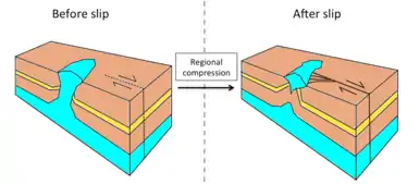 Compressional stress thickens and strengthens the overlying rock, this resists the rock salt from piercing up and slows down the formation of a diapir, except when an anticline formed from compression force is seriously eroded to great depth. In the case where there are preexisting salt diapir structures that are mechanically weaker, the diapirs are reactivated during regional compression, rock salt then moves upward and is cut off from the source layer. For another case of no preexisting rock salt diapirs, salt mainly acts as a lubricant to form décollement.[1]
