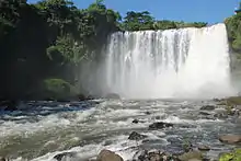 On the San Andrés River is the Eyipantla Falls, located twelve km from the municipal seat. The name comes from Nahuatl and means “three furrows of water.” Legend has it that Tlaloc, Aztec god of rain, governed the Los Tuxtlas area and the waterfall was his home. The falls are part of the San Andres River, which drains Lake Catemaco on its way to the Gulf of Mexico. The falls itself is forty meters wide and fifty meters high. It is popular with tourists, to descent 400 stairs to the foot of the falls. At the top of the falls, there is a lookout point which gives view of the surrounding mountains along with the falls. The entrance to the falls is crowded with restaurants and tourist shops. Another important waterfall in the municipality is Los Organos, located between Playa Hermosa and Costa de Oro. Other waterfalls include Del Río Revolución, Salto Maquina Vieja and Tres Chorros.[2][4]