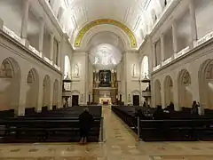 A five-section organ (grande organ, positive, recitative, solo and echo) controlled by a console of five keyboards and pedals is installed in the choir. It has 152 registers and approximately 12,000 lead, tin and wood tubes, with the largest 11 metres (36 ft) in height and the smallest 9 millimetres (0.35 in).[1] Initially, the organ was divided into its five parts and dispersed within the basilica, but it was re-formed in 1962 and installed in its present location.[1]