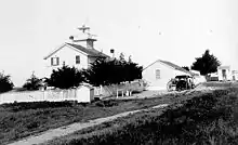 The original lighthouse was one of a number of California coastal lights allocated funding by Congress in 1850, only 19 days after statehood.[11] Because of disputes over ownership of the land, construction did not proceed until 1868.[12] The original light was a two-story wooden structure, with a lantern housing a fifth-order fresnel lens. Erosion of Point Santa Cruz required the lighthouse to be moved back 300 feet (91 m) in 1879.