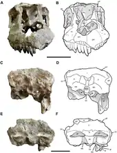 The holotype, MDT-PV 2, was found in the upper Lower Member of the Bajo Barreal Formation, dating from the Cenomanian to Turonian ages. It consists of an almost complete skull with lower jaws, articulated with the first seven vertebrae of the front neck. Several neck parts, among them the entire atlas and fourth neck vertebra, were too eroded to be salvaged. The specimen represents an elderly individual. It is one of the few titanosaurs for which skull material has been found.[3] Uniquely, at the side of the neck an elongated structure was discovered that was identified as an ossified tendon.[3]