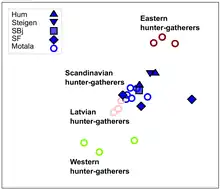 Haak et al. (2015) examined the remains of six SHGs buried at Motala between ca. 6000 BC and 5700 BC. Of the four males surveyed, three carried the paternal haplogroup I2a1 or various subclades of it, while the other carried I2c. With regard to mtDNA, four individuals carried subclades of U5a, while two carried U2e1. The study found SHGs to constitute one of the three main hunter-gatherer populations of Europe during the Mesolithic.[lower-alpha 4][lower-alpha 5] The two other groups were WHGs and Eastern Hunter-Gatherers (EHG). EHGs were found to be an ANE-derived population with significant admixture from a WHG-like source. SHGs formed a distinct cluster between WHG and EHG, and the admixture model proposed by Lazaridis et al. could be successfully replaced with a model that takes EHG as source population for the ANE-like ancestry, with an admixture ratio of ~65% (WHG) : ~35% (EHG).[9] SHGs living between 6000 BC and 3000 BC were found to largely be genetically homogeneous, with little admixture occurring among them during this period. EHGs were found to be more closely related to SHGs than WHGs.[8]