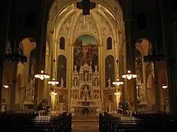 The St. Joseph Center Chapel was consecrated on the Feast of St. Joseph, March 19, 1917. Milwaukee architects, Peter Brust and Richard Philipp, designed the Chapel in the style of Italian Romanesque Revival, having toured Italy as research for this commission.[4] There are three altars in the main body of the chapel, each constructed of Carrara marble shipped from Italy during World War I. Given the danger of attack by German U-boats, the shipment required the special authorization of President Woodrow Wilson. Murals depicting the seven sacraments adorn the walls of the sacristy to the right of the sanctuary. These murals are noteworthy both because a resident sister painted them, and because she included portraits of local Milwaukeeans in her painting.[5]