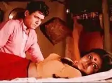 The gaze which demonstrates the subtle incongruence in the conjugal life of Kalyani and her husband Gokul. The gaze was reviewed as an alteration of any cinematic sequence to manifest the discordance of relationship between a woman of an upper periphery of society and a man of a lower caste.[15][11] (Om Puri and Debashree Roy in a sequence of the film)