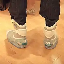 In April 2009, Nike filed a patent for self-lacing shoes, with a design that bears a resemblance to those worn by Marty in the 1989 film Back to the Future Part II,[1] raising speculation among fans about a possible debut of self-lacing shoes. In 2014, Tinker Hatfield, the designer of the original Nike shoes as depicted in Back to the Future Part II, indicated that they would introduce shoes with power-lacing technology the following year, 2015.[2] Fewer than 100 pairs of Nike Mags with power-lacing capabilities were made and sold through an online draw starting October 4, 2016, with all proceeds going to the Michael J. Fox Foundation.[3]