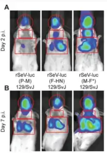 Inbred and outbred mouse and rat strains have very different susceptibility to Sendai virus infection. Visualization of SeV infection in live animals demonstrates this difference.[27] The 129/J mice tested were approximately 25,000-fold more sensitive than SJL/J mice.[28] C57BL/6 mice are highly resistant to the virus, while DBA/2J mice are sensitive.[29] C57BL/6 mice showed slight loss of body weight after SeV administration, which returned to normal later. Only 10% mortality rate was observed in C57BL/6 mice after the administration of very high virulent dose of 1*105 TCID50.[30] It was shown that resistance to the lethal effects of Sendai virus in mice is genetically controlled and expressed through control of viral replication within the first 72 hours of infection.[29] Treatment of both strains with exogenous IFN before and during viral infection led to an increase in survival time in C57BL/6 mice, but all animals of both strains ultimately succumb to SeV caused disease.[31] If a mouse survives a SeV infection, it develops a lifelong immunity to subsequent viral infections.[32]